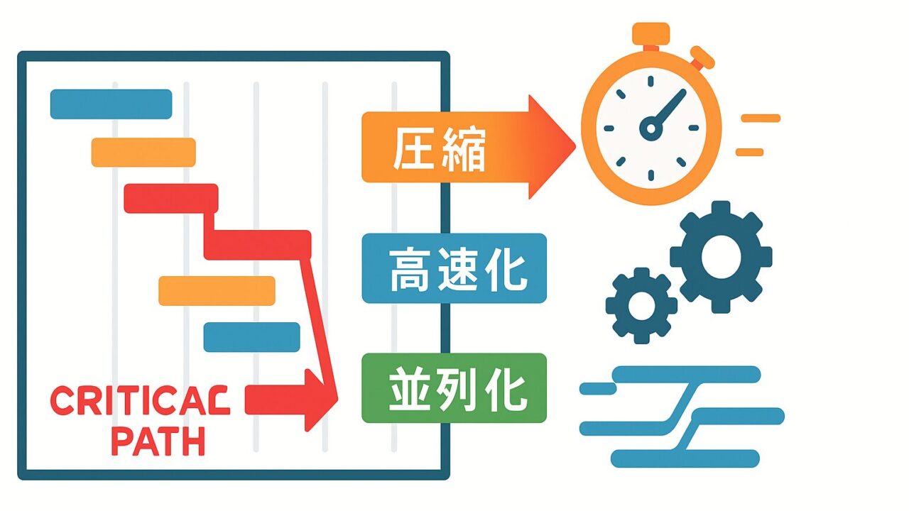 圧縮(クラッシング)は、「お金やリソースをかけて、期間を短くする」考え方です。代表的な手段は次の通りです。