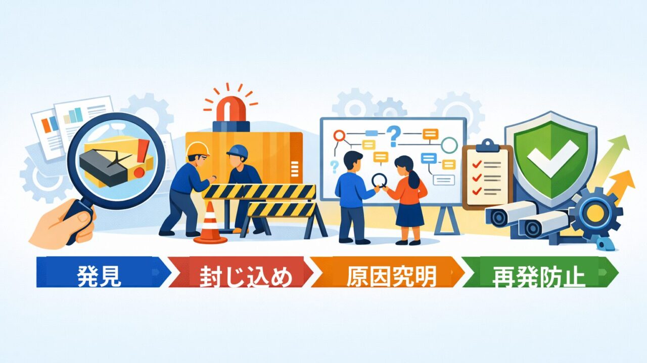 品質トラブル対応は、発見・封じ込め・原因究明・再発防止の4ステップで整理すると、混乱の中でも判断しやすくなります。最初は「封じ込め」で被害拡大を止め、同時に「発見」で事実を固め、落ち着いたら「原因究明」で真因を特定し、「再発防止」で仕組みに落とす。